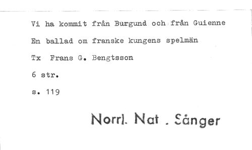 //// Vi ha kommit från Burgund och från Guienne En ballad om franske kungens spelmän Tx Frans G. Bengtsson 6 str. s. 119 //// Norri. Nat . Sånger