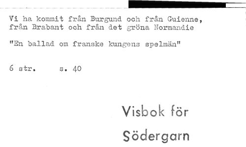 //// Vi ha kommit från Burgund och från Guienne, från Brabant och från det gröna Normandie //// "En ballad om franske kungens spelmän" //// 6 str. s. 40 //// Visbok för Södergarn