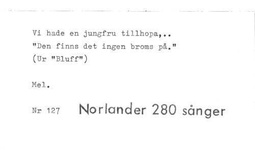 //// Vi hade en jungfru tillhopa,.. "Den finns det ingen broms på." (Ur "Bluff") //// Mel. //// Nr 127 Nor!ander 280 sånger