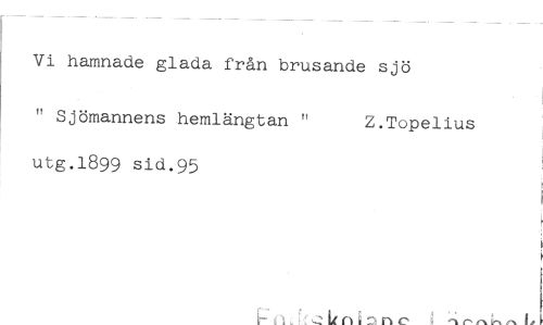 //// Vi hamnade glada från brusande sjö //// " Sjömannens hemlängtan " Z.Topelius utg.1899 sid.95