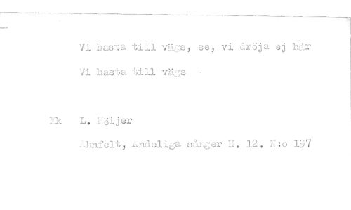 //// Vi hasts, till vägs, se, vi dröja ej här //// Vi hasta till vägs //// Mk L. Lsijer //// -Imfélt, Andeliga sånger H. 12. N:o 197