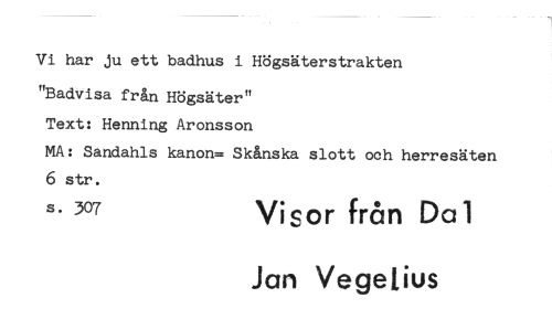 //// Vi har ju ett badhus i HSgsäterstrakten //// "Badvisa från HSgsäter" //// Text: Henning Aronsson //// MA: Sandahls kanon= Skånska slott och herresäten 6 str. //// s. 307 //// Dal //// Jan Vegetius