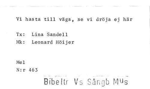 //// Vi hasta till vägs, se vi dröja ej här //// Tx: Lina Sandell Mk: Leonard Höijer //// Mel //// N:r 463 //// Bibettr Vs Sångb M^s
