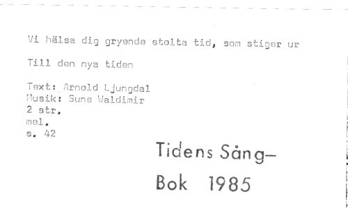 //// 'Ji hälsa dig gryende stolta tid, som stiger ur //// Till den nya tiden //// Text: Arnold Ljungdal Husik: Sune Waldimir 2 str. mel. s. 42 //// Tidens Sång- //// Bok 1985