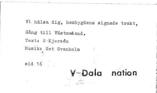 //// Vi hälsa dig, hembygdens signade trakt, //// Sång till VästmaxLand. //// Text: S-Kjersén Musik: Set Svanholm //// sid 1 6 //// V-Oa!a nation