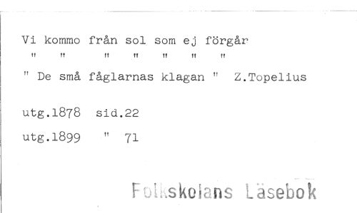 //// Vi kommo från sol som ej förgår 't t! !t t! t! !t ft //// " De små fåglarnas klagan " Z.Topelius //// utg.1878 sid.22 utg.1899 " 71 //// FbLskoicns Låsebok