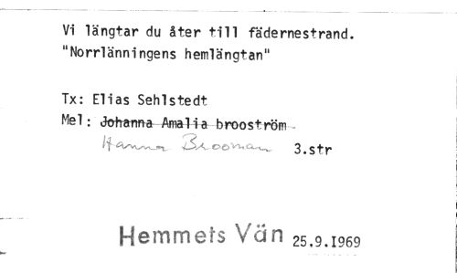 //// Vi längtar du åter till fädernestrand. "Norrlänningens hemlängtan" //// Tx: Elias Sehlstedt //// Mel: JeMiwa- Art&Ma brooström //// 3.str //// [-[e!Y!me!^s Vån 25.9.1969