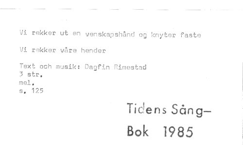 //// Vi rekker ut en uenskapshånd og knyter fast //// Vi rekker våre hender //// Text och musik: Dagfin Rimestad 3 str, mei. //// s. 125