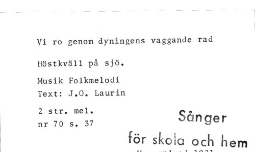 //// Vi ro genom dyningens vaggande rad //// Höstkväll på sjö. //// Musik Folkmelodi Text: J.O. Laurin //// 2 str. mel. nr 70 s. 37 //// för skoia och hem