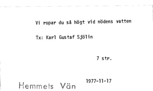 //// Vi ropar du så högt vid nödens vatten Tx: Karl Gustaf Sjölin //// 7 str. //// nimets Vän //// 1977-11-17