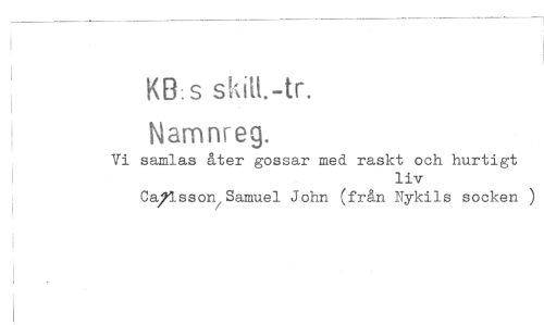 //// KBs skiH.-tr. Namnreg. //// Vi samlas åter gossar med raskt och hurtigt //// liv //// Ca^lsson^Samuel John (från Nykils socken )