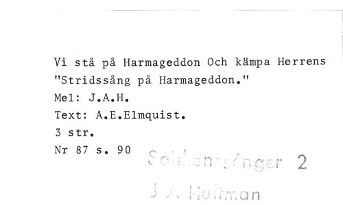 //// Vi stå på Harmageddon Och kämpa Herrens "Stridssång på Harmageddon." //// Mel: J.A.H. //// Text: A.E.Elmquist.