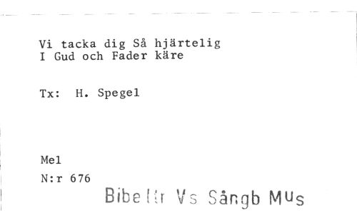 //// Vi tacka dig Så hjärtelig //// I Gud och Fader käre //// Tx: H. Spegel //// Mel //// N:r 676 //// Bibe![r Vs Sångb M^s
