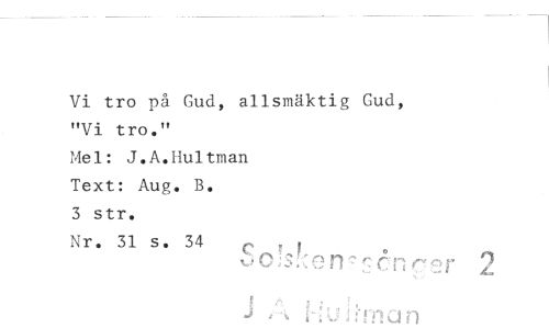 //// Vi tro på Gud, allsmäktig Gud, //// "Vi tro." //// Mel: J.A.Hultman Text: Aug. B. //// 3 str. //// Nr. 31 s. 34 ^ , < //// n"^cn2 ^ renman