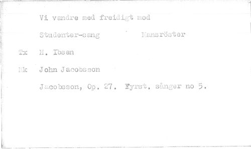 //// Vi vanare med freidigt mod //// Studente r-c sng //// H. Ibs en J ohn J acobsson //// lians rost er //// J&cobsson, Op. 27. ?yrst, sänger no 5.