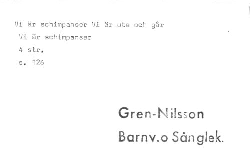//// Vi är schimpanser Vi är ute och går Vi är schimpanser 4 str. s. 126 //// Gren-N i!sson Barnv.o Sång!ek.