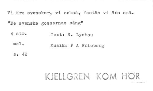 //// Vi äro svenskar, vi också, fastän vi äro små. //// "De svenska gossarnas sång" //// 4 str. Text: S. Lychou //// mel. Musik: F A Frieberg //// s. 42 //// KJELLGREN KOM HOR