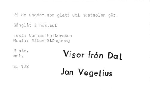 //// Vi är ungdom som glatt uti höstsolen går //// Gånglåt i höstsol //// Text: Gunnar Pettersson Musik: Ollan Stångberg //// 3 str. //// mel. //// s. 102 //// Visor från Dat Jan Vegetius
