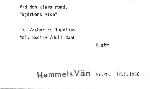//// Vid den klara rand. "Björkens visa" //// Tx: Zacharias Topélius Mel: Gustav Adolf Raab //// Hemmets Vän //// 8.str //// Nr.20. 18.5.1966