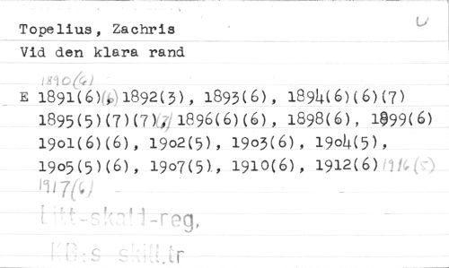 //// Topelius, Zachris Vid den klara rand //// E 1891(6)^1892(3), 1893(6), 189^(6) (6) (7) //// I895(5)(7)(7)^i896(6)(6), 1898(6), i$99(6) 1901(6)(6), 1902(5), 1903(6), i9o4(5), 1905(51(6), 1907(5), 1910(6), 1912(6):