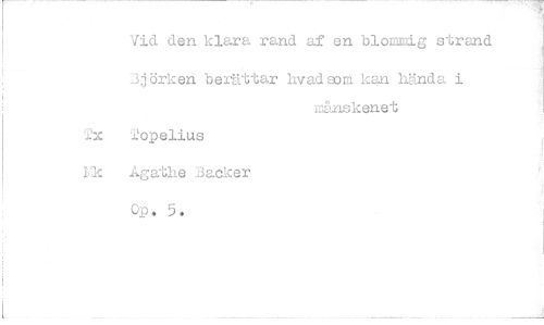 //// Vid den klara rand af en blommig strand //// Björken berättar hvad aom kan hända i //// ns.nskenet //// 2opelius Ågathe Backer Op. 5.