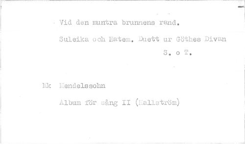 //// Vid den muntra brunnens rand. //// Suleika och Eatem, Duett ur Göthes Divan //// S. o T, //// hk Hendelssohn //// Album för sång II (Hallström)