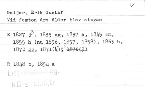 //// Gei jer, Erik Gustaf //// Vid femton års ålder blev stugan //// E 1827 j3, 1835 gg, 1837 a, 1845 Mm, 1855 h (nu 1856, 1857, 1858), 1863 187O gg, l871(^)e^3?^4,3). //// R 1848 c, 1854 a //// L