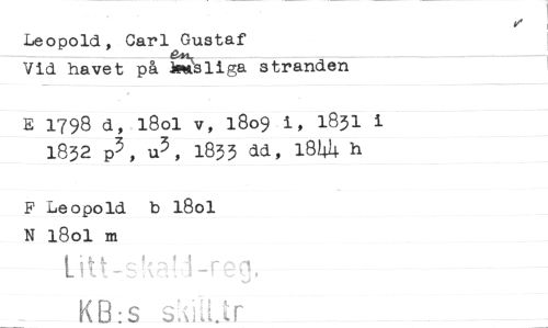 //// Leopold, Carl Gustaf //// --- --- ---— -é*t,... //// Vid havet på Jmsliga stranden //// E 1798 d, l8ol v, 1809 i, 1831 1832 p3, u3, 1833 dd, 18^ h //// F Leopold b l8ol N 180I m