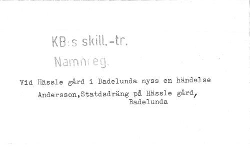 //// KB:S skiH.-tr. //// Mamnreg. //// Vid Hässle gård i Badelunda nyss en händelse //// Andersson,Statdsdräng på Hässle gård^ //// Badelunda