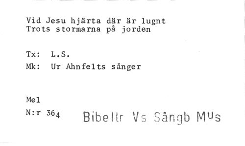 //// Vid Jesu hjärta där är lugnt Trots stormarna på jorden //// Tx: L.S. //// Mk: Ur Ahnfelts sånger //// Mel //// N:r 364 !tr Vs Sångb