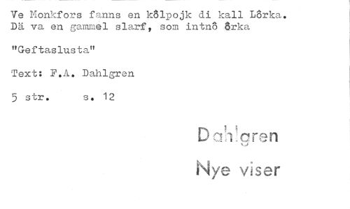 //// Ve Monkfors fanns en kolpojk di kall Lorka. Dä va en gammel slarf, som intno 6rka //// "Geftaslusta" //// Text: F.A. Dahlgren //// 5 str. s. 12 //// Nye viser