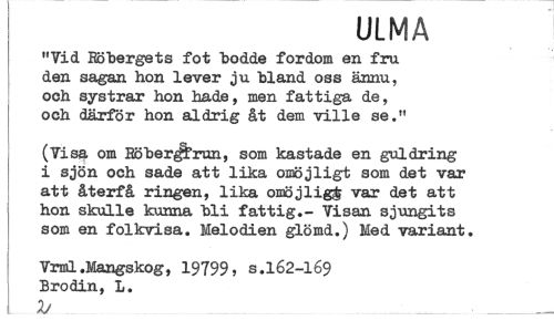 //// ULMA //// "Vid Bobergets fot bodde fordom en fru. den sagan hon lever ju bland oss ännu, och systrar hon hade, men fattiga de, och därför hon aldrig åt dem ville se." //// (Visa om Röber^fron, som kastade en guldring i sjön och sade att lika omöjligt som det var att återfå ringen, lika omöjligt var det att hon skulle kunna bli fattig.- Visan sjungits som en folkvisa. Melodien glömd.) Med variant. //// Vrml.Mangskog, 19799? s.162-169 Brodin, L. 3 //// /