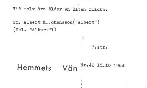 //// t //// Vid tolv års ålder en liten flicka. //// Tx. Albert M.Johansson("Albert") (Mel. "Albert"?) //// 7f. str. //// Hemmets Vän