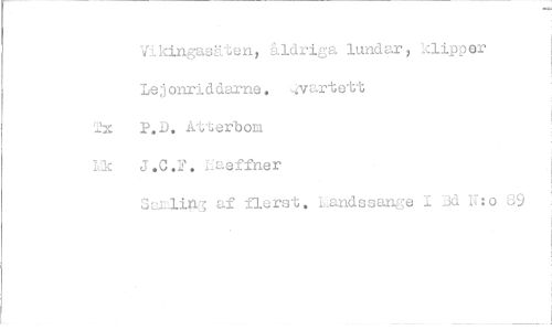 //// Vikingasäten, åldriga lundar, klippor Lejonriddarne. ovartett P.D. Atterbom //// 1.3c J.C.F, liaefiher //// San-Li4[! af flerst. Landssange I 3d N:o