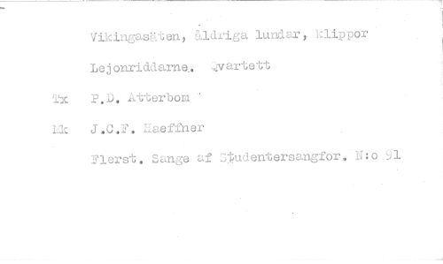 //// Vikingasäten, åldriga lundar, klippor Lejonriddarne.. ^vartett ?,D. Atterbom J.C.F. Ilaeffner //// Flerst. Sange af 3j:udentersangfor, N:o