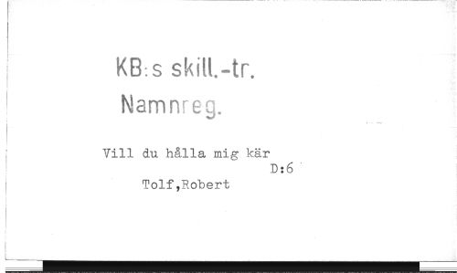 //// KB:s skitt.-tr. //// Namnreg. //// Vill du hålla mig kär //// D //// Tolf,Robert