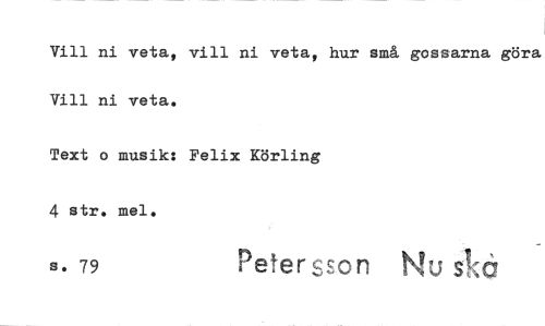 //// Vill ni veta, vill ni veta, hur små gossarna göra Vill ni veta. //// Text o musik: Felix Körling 4str. mel. //// s. 79 Petersson Nu s!(å