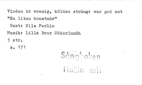 //// Vinden är vresig, kölden sträng: var god mot "En liten konstnär" //// Text: Nils Ferlin Husik: Lille Bror Söderlundh 3 str. s. 171 //// Sån fr* o!'en
