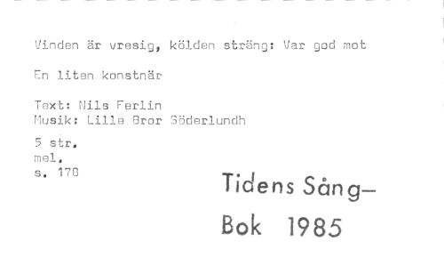 //// Vinden är vresig, kölden sträng: Var god mot //// r!n liten konstnär //// Text: Nils Ferlin //// Musik: Lille Bror Söderlundh //// 5 str. mel. //// s. 173