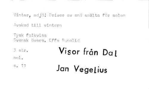 //// Vinter, adjöj Drivor av snö smälta för sol Hvsksd till vintern Tysk folkvisa //// Svensk övers, Effe Runelid //// 3 str. Visor från Da t Jan Vegetius
