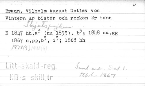 //// Braun, Vilhelm August Detlev von //// Vintern är bister och rocken är tunn //// f * //// ^ t—*' //// E 18^7 hh.a^ 1853), b^; 1848 aa,gg //// 1867 n,pp,b^, i^; 1868 hh //// Lttt-ska! -reg, //// [(B:s s!u*Ltr