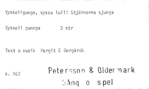 //// Vysseligunga, vyssa tull! Stjärnorna sjunga //// Vysseli //// Text o //// s. 167 //// gunnaa 3 str //// musik Margit E Gergårdh //// Pete r^son : Säng o //// 0(der iark s pe)