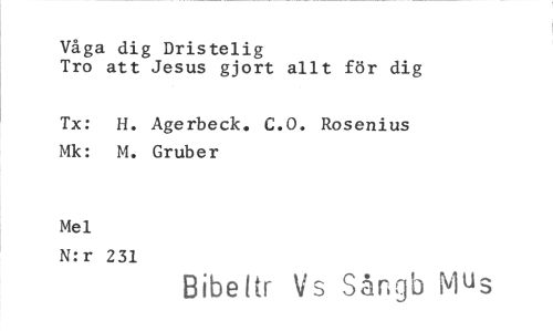 //// Våga dig Dristelig //// Tro att Jesus gjort allt för dig //// Tx: H. Agerbeck. C.O. Rosenius Mk: M. Gruber //// Mel //// N:r 231 //// Bibear Vs Sår.gb