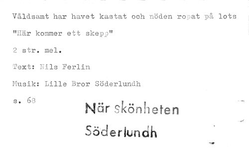 //// Våldsamt har havet kastat och noden rop "Hår kommer ett skepp" //// 2 str. mel. //// Text: Nils Ferlin //// Musik: Lille Bror Söderlundh //// s. 68 //// När skönheten
