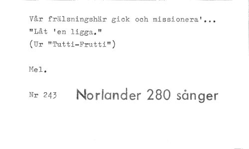 //// Vår frälsningshär gick och missionera'... "Låt 'en ligga." //// (Ur "Tutti-Frutti") //// Mel. //// Nr 243 Nortander 280 sånger
