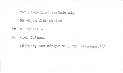 //// Vår gamla Lisa skrämde mig På vägen från skolan Tx Z. Topelius Mk Axel Löthner //// Löthner, Sex sånger till "En barndomsdag"