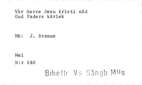 //// Vår Herre Jesu Kristi nåd Gud Faders kärlek //// Mk: J. Branun //// Mel //// N:r 580 //// Bibettr Vs Sångb