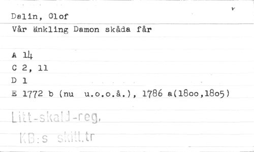 //// Dalin, Olof //// Vår änkling Damon skåda får //// A 1^ //// C 2, 11 Dl //// E 1772 b (nu u.o.o.å.), 1?86 a(l8oo,l8o5)