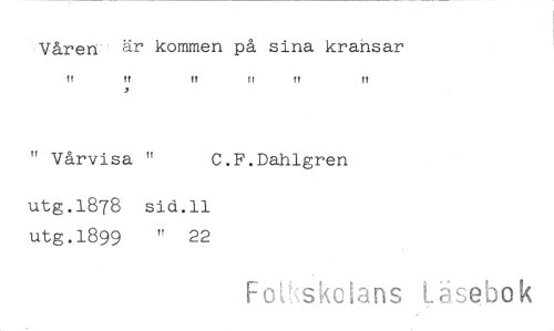 //// Våren är kommen på sina kransar //// tf !t !f //// " Vårvisa " C. //// utg.1878 sid.11 utg.1899 " 22 //// H !! t! //// F.Dahlgren //// Folkskolans Läsebok