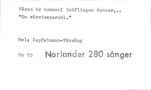 //// Våren är kommen! Snöflingan dansar,.. "En vårviseparodi." //// Mel: Kapfelmann-Vårsång //// Nr 70 Nortander 280 sånger
